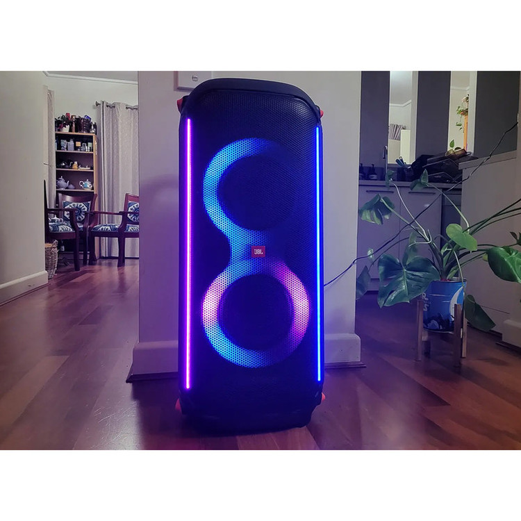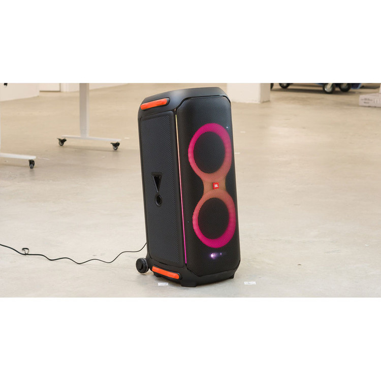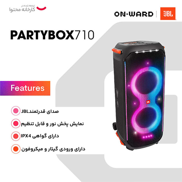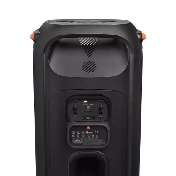 PARTY BOX 710 با ابعاد ۳۹.۹x۹۰.۵x۴۳.۶ سانتیمتر و وزنی معادل ۲۷.۸ کیلوگرم در دسته پخشکنندههای خانگی سنگین و حجیم قرار میگیرد، اما این ابعاد بهطور کامل در خدمت ارائه صدایی قدرتمند و با کیفیت است. بدنه دستگاه از پلاستیک مقاوم ساخته شده که علاوه بر کاهش وزن نسبت به بدنههای فلزی، دوام خوبی در برابر ضربه و استفاده طولانیمدت دارد. نورپردازی RGB یکی از شاخصترین عناصر طراحی این پخشکننده است. این نورها قادرند در هماهنگی کامل با ضربآهنگ موسیقی حرکت کنند، فضای محیط را به یک صحنه اجرای زنده تبدیل کنند و تجربه شنیداری و دیداری کاربر را همزمان ارتقا دهند. طراحی شکوهمند جلوی دستگاه که میزبان بلندگوها، دو سابووفر و چراغهای رنگی است، بر حس مدرن و هیجانانگیز دستگاه میافزاید. توان خروجی کلی این مدل برابر با ۸۰۰ وات بوده که تضمینکننده صدایی قدرتمند با حجم بالا است. وجود دو سابووفر اختصاصی، همراه با دو توییر، طیف کامل صدا را از بیسهای عمیق تا نتهای زیر و شفاف پوشش میدهد. محدوده پاسخ فرکانسی دستگاه بین ۳۵ تا ۲۰۰۰۰ هرتز است که به معنای پوشش گسترده صدای طبیعی و موسیقی از فرکانسهای پایین تا بالا محسوب میشود. PARTY BOX 710 مجهز به آمپلیفایر اکتیو است که کنترل دقیق و پردازش پیشرفته صدا را ممکن میسازد. فناوری BassUp بیس موسیقی را تقویت کرده و باعث ایجاد حس غرق شدن در صدا میشود. صدای ۳۶۰ درجه، که در نتیجه طراحی دقیق و فناوری JBL Pro Sound ایجاد شده، مخاطب را از هر زاویه در جریان موسیقی قرار میدهد و کمترین افت کیفیت را در بخشهای مختلف محیط به همراه دارد.