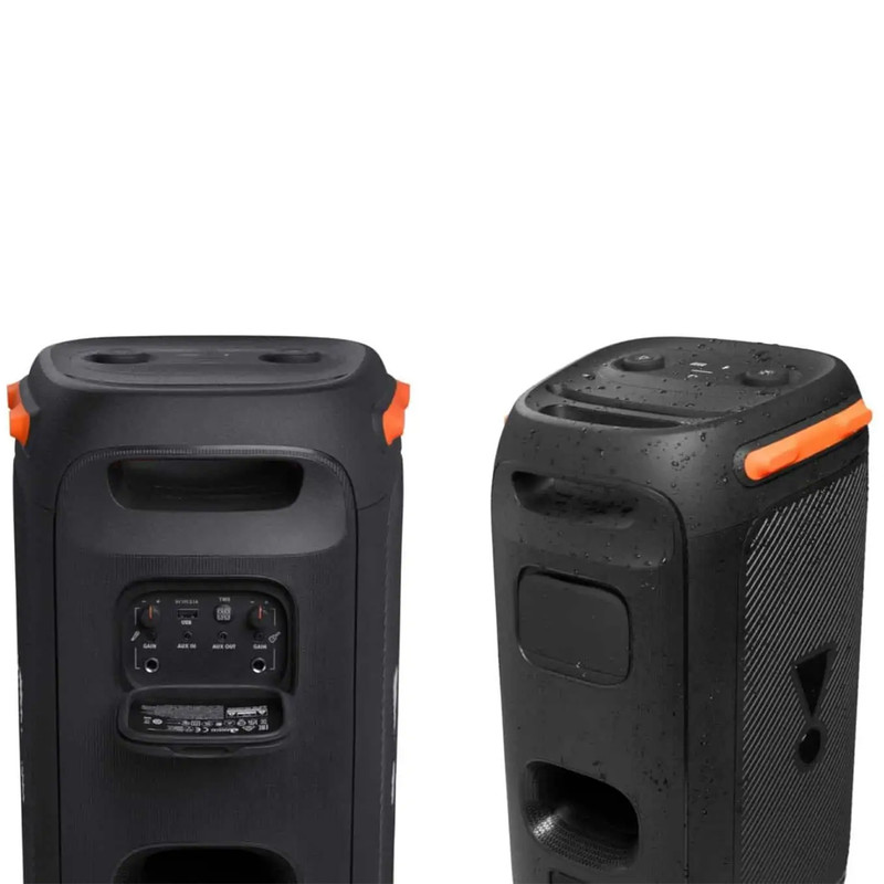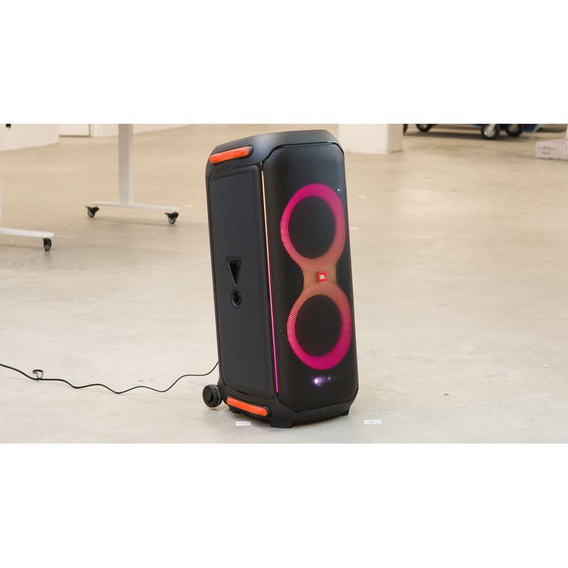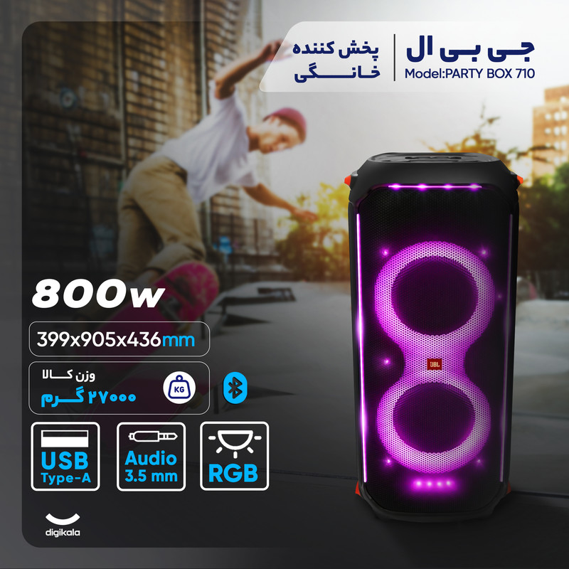 PARTY BOX 710 با ابعاد ۳۹.۹x۹۰.۵x۴۳.۶ سانتیمتر و وزنی معادل ۲۷.۸ کیلوگرم در دسته پخشکنندههای خانگی سنگین و حجیم قرار میگیرد، اما این ابعاد بهطور کامل در خدمت ارائه صدایی قدرتمند و با کیفیت است. بدنه دستگاه از پلاستیک مقاوم ساخته شده که علاوه بر کاهش وزن نسبت به بدنههای فلزی، دوام خوبی در برابر ضربه و استفاده طولانیمدت دارد. نورپردازی RGB یکی از شاخصترین عناصر طراحی این پخشکننده است. این نورها قادرند در هماهنگی کامل با ضربآهنگ موسیقی حرکت کنند، فضای محیط را به یک صحنه اجرای زنده تبدیل کنند و تجربه شنیداری و دیداری کاربر را همزمان ارتقا دهند. طراحی شکوهمند جلوی دستگاه که میزبان بلندگوها، دو سابووفر و چراغهای رنگی است، بر حس مدرن و هیجانانگیز دستگاه میافزاید. توان خروجی کلی این مدل برابر با ۸۰۰ وات بوده که تضمینکننده صدایی قدرتمند با حجم بالا است. وجود دو سابووفر اختصاصی، همراه با دو توییر، طیف کامل صدا را از بیسهای عمیق تا نتهای زیر و شفاف پوشش میدهد. محدوده پاسخ فرکانسی دستگاه بین ۳۵ تا ۲۰۰۰۰ هرتز است که به معنای پوشش گسترده صدای طبیعی و موسیقی از فرکانسهای پایین تا بالا محسوب میشود. PARTY BOX 710 مجهز به آمپلیفایر اکتیو است که کنترل دقیق و پردازش پیشرفته صدا را ممکن میسازد. فناوری BassUp بیس موسیقی را تقویت کرده و باعث ایجاد حس غرق شدن در صدا میشود. صدای ۳۶۰ درجه، که در نتیجه طراحی دقیق و فناوری JBL Pro Sound ایجاد شده، مخاطب را از هر زاویه در جریان موسیقی قرار میدهد و کمترین افت کیفیت را در بخشهای مختلف محیط به همراه دارد.